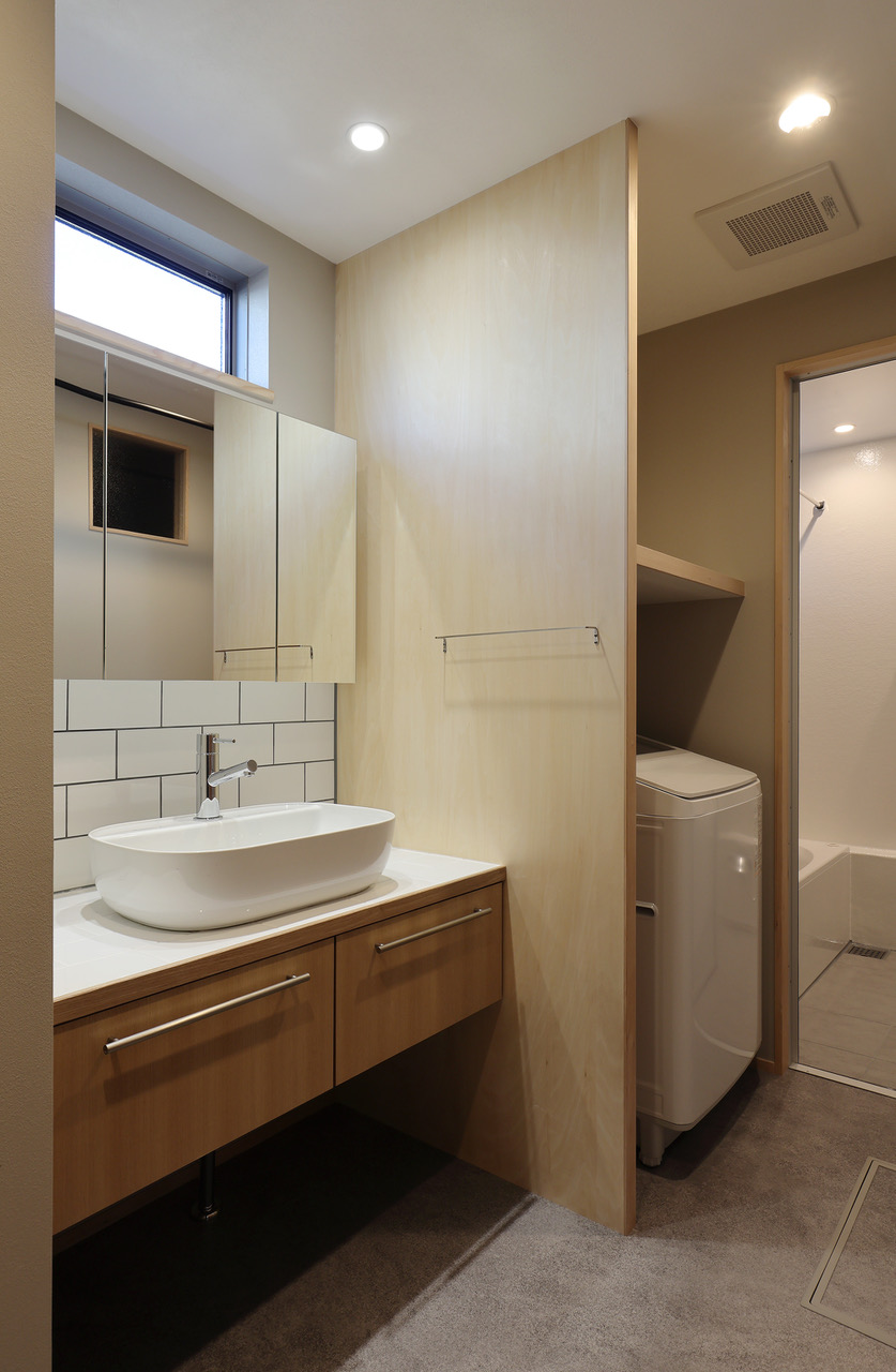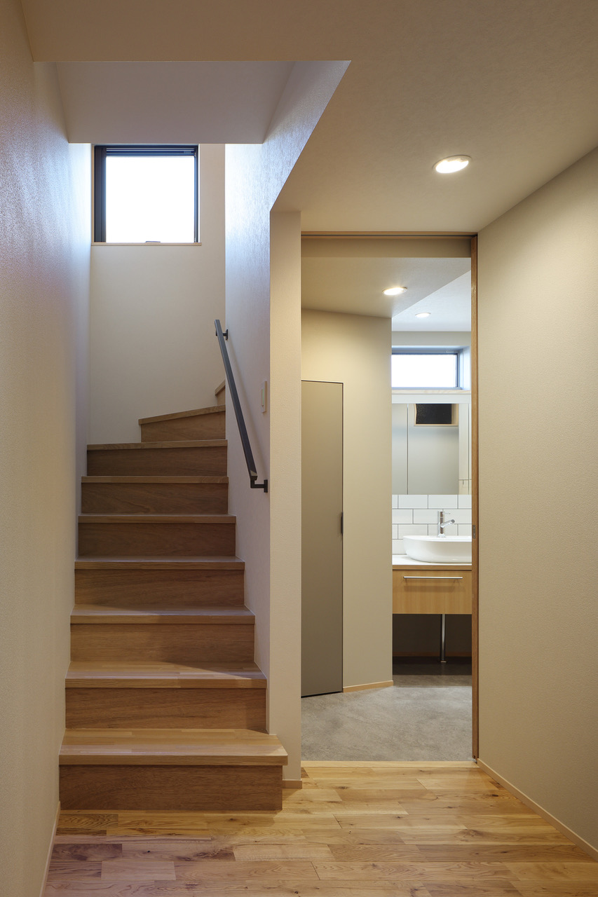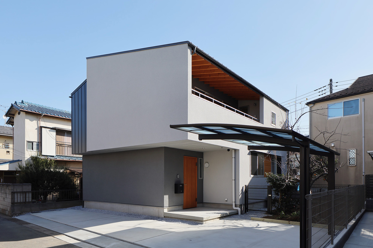 50坪余りの敷地であるが2台分の駐車スペースを確保するために、2階を道路側に張り出すことで玄関部分に軒先空間を確保するとともに基礎面積を抑えている。