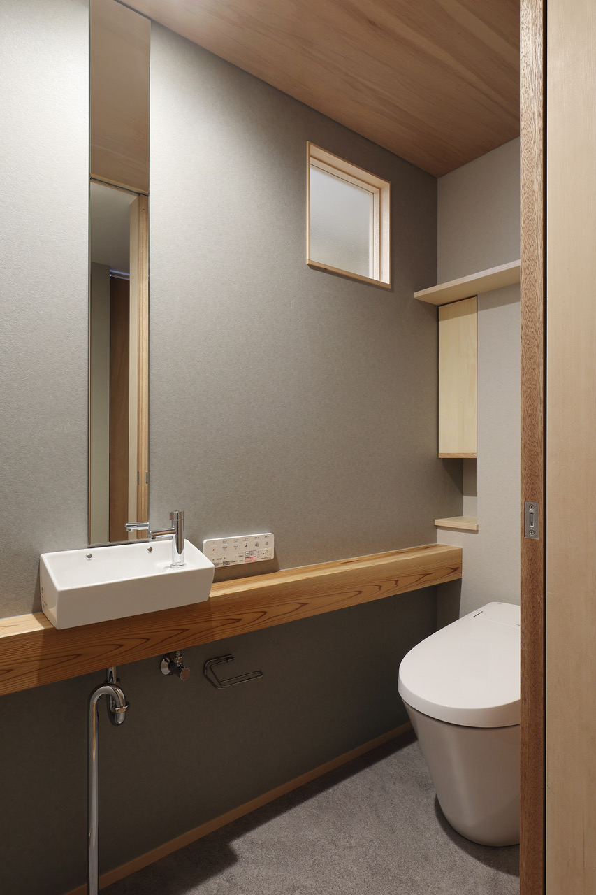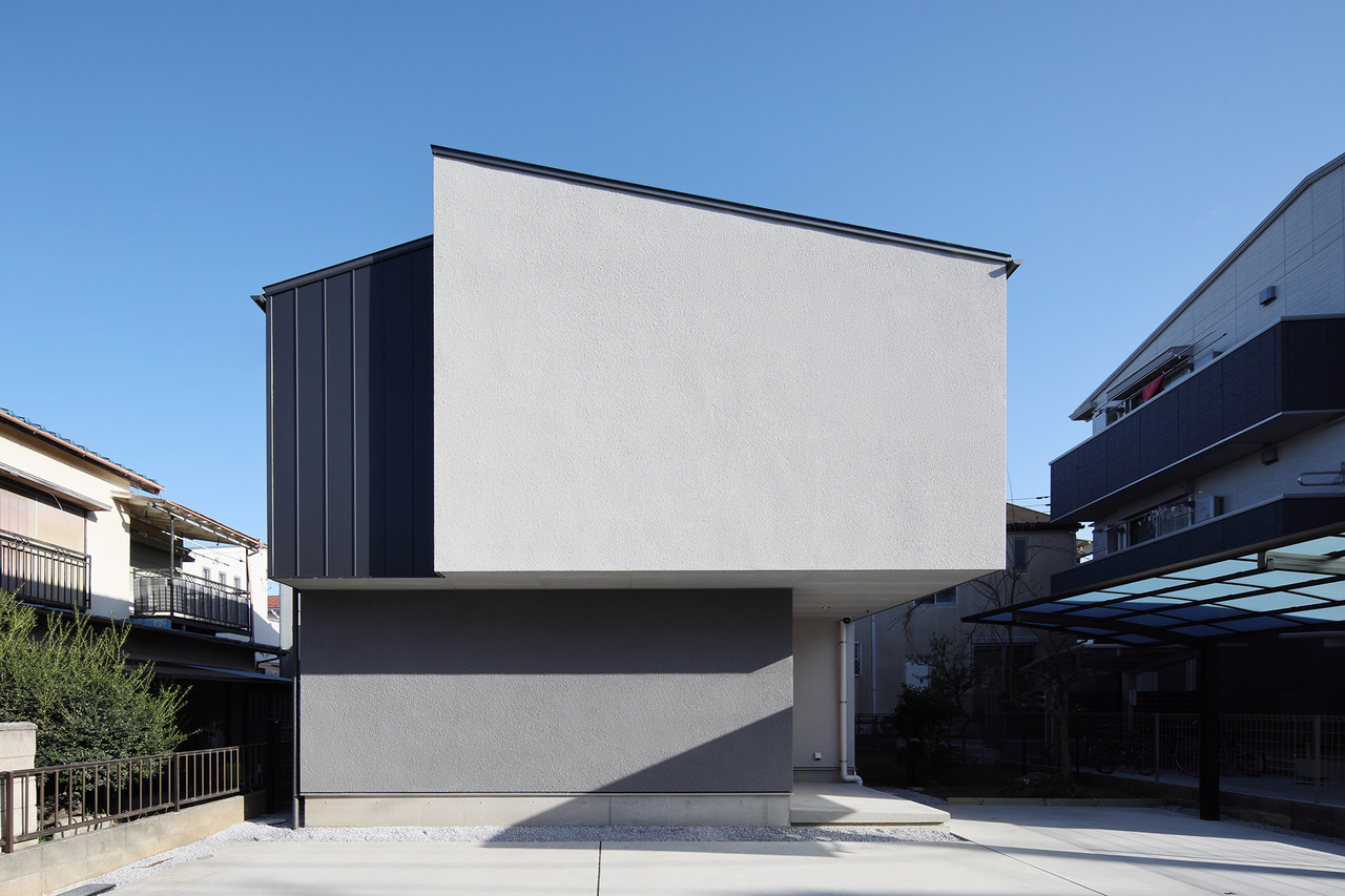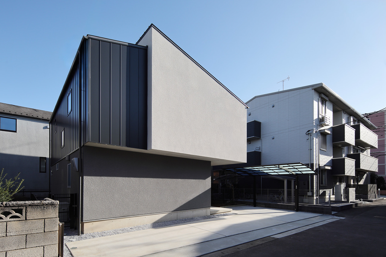 外壁は肌のある2色の吹き付けタイル、北側2階にはブラックのガルバリウム鋼板のサイディングを用いており、片流れ部分の屋根には太陽光パネルを設置した。元の古い家屋の庭にあったりんごと金柑の木はそのまま残し、土地の記憶を継承した。