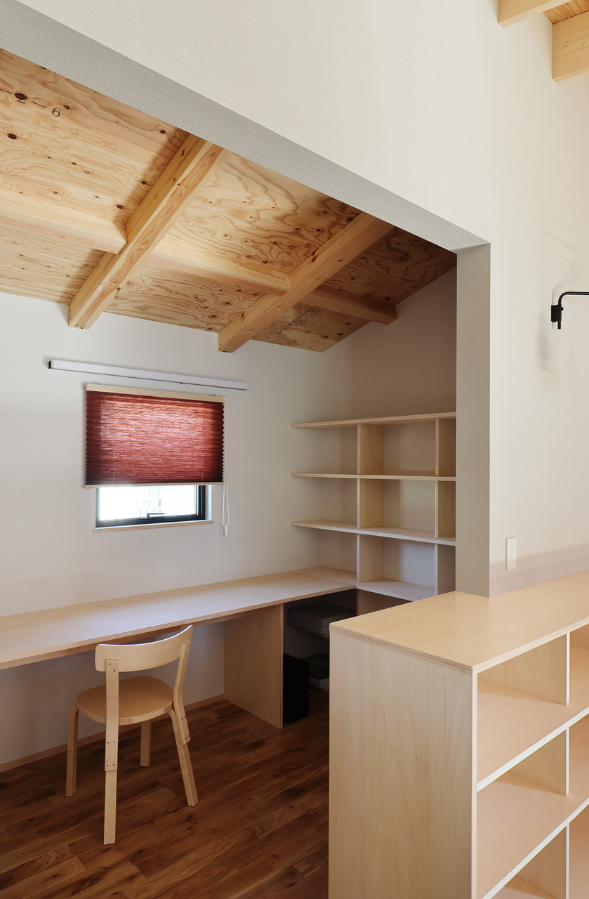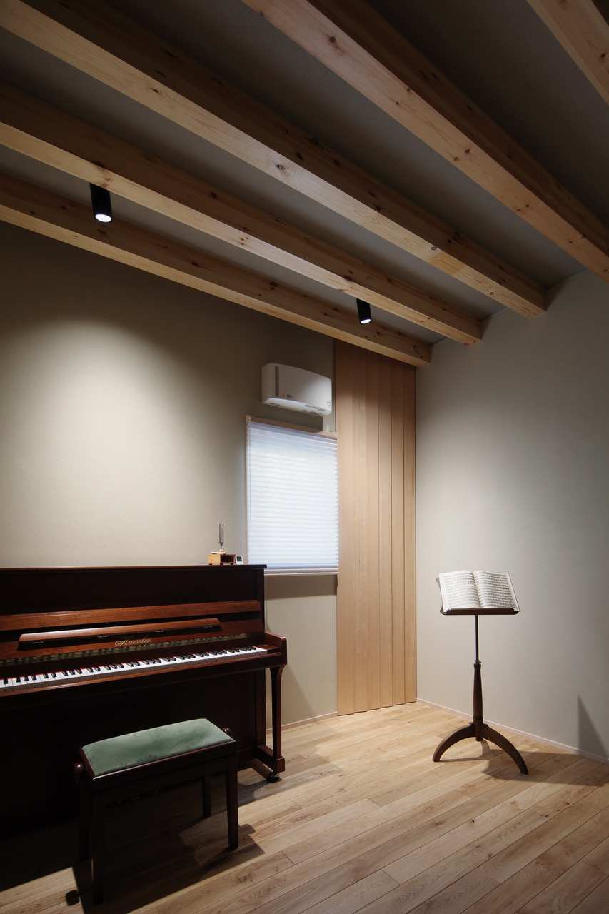 それぞれ働く若いご夫婦の新居で、趣味のバイオリン用防音仕様演奏室とサーバーを備える仕事部屋を兼ねた書斎を1階に設けるというのが設計条件。