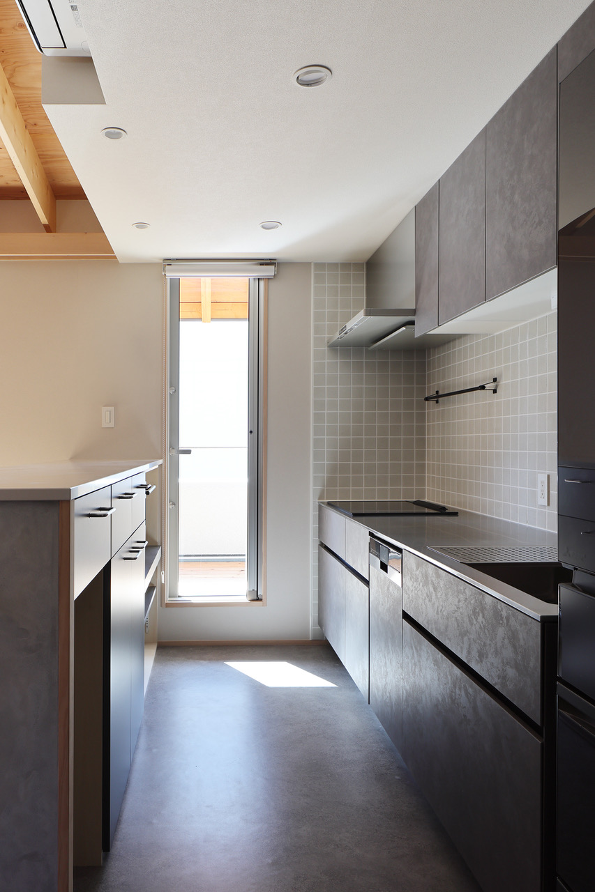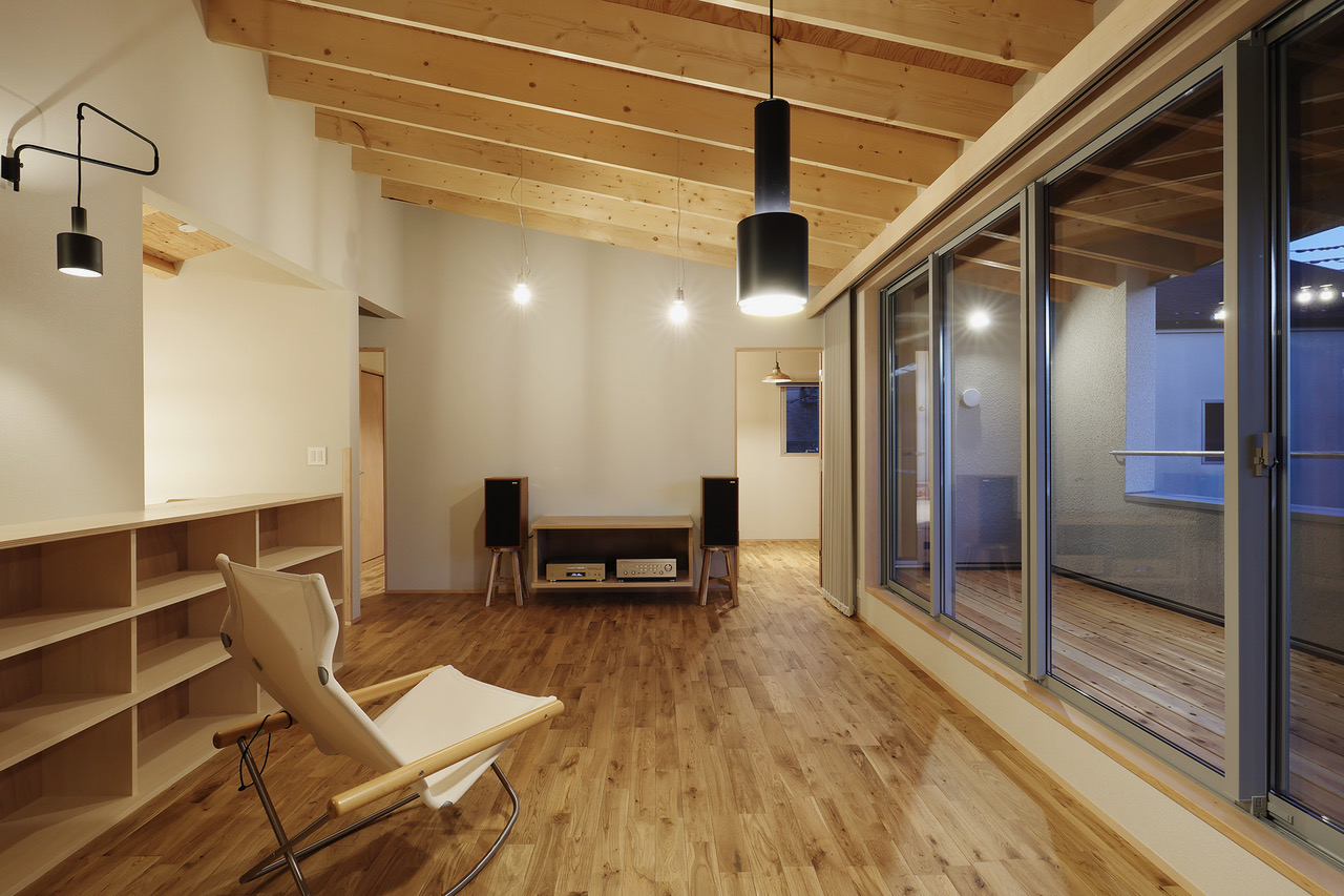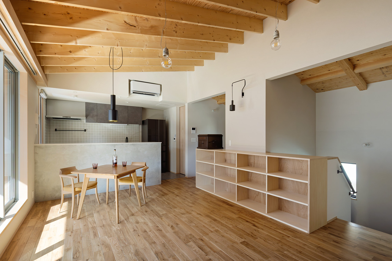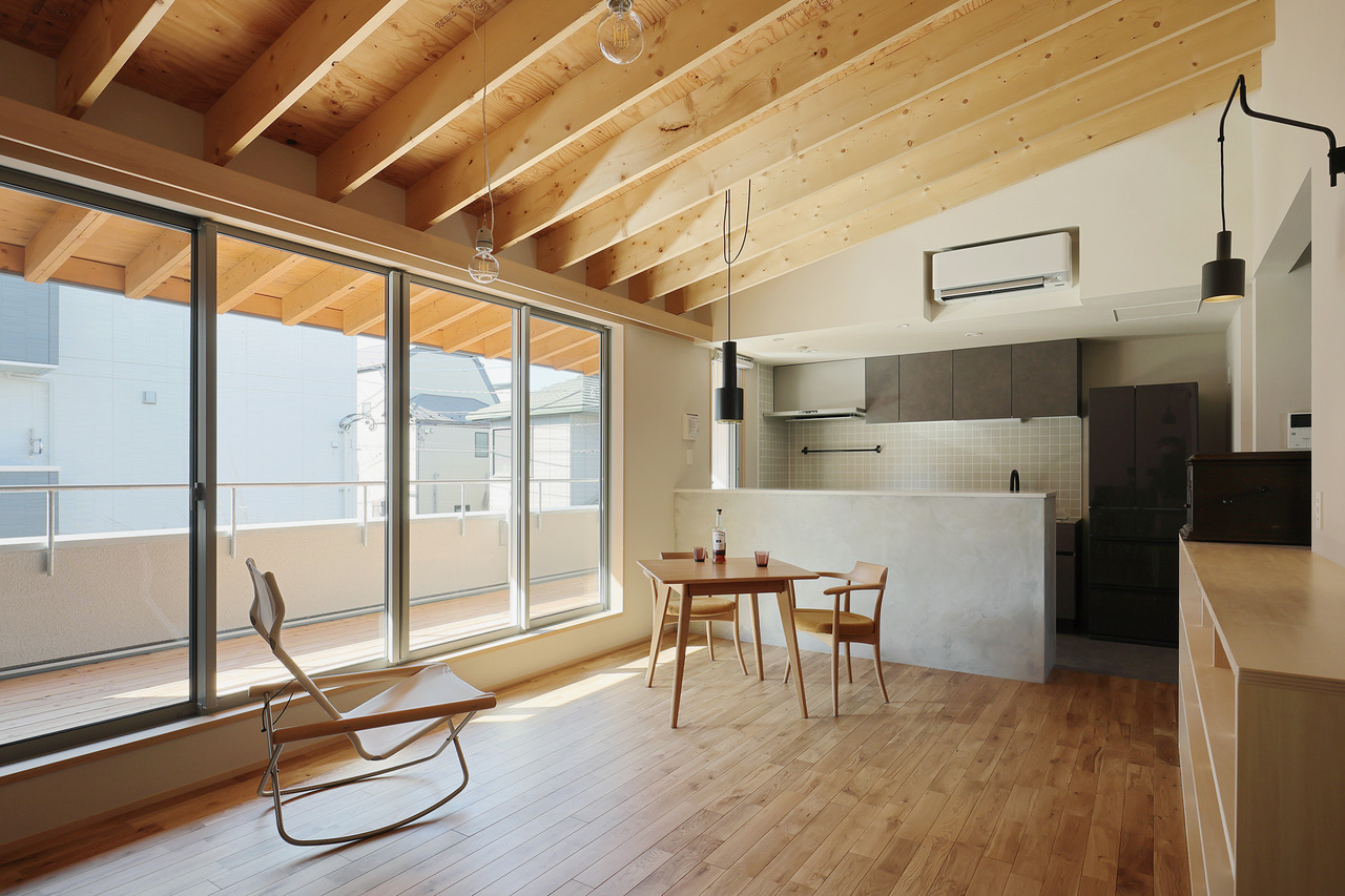 2階のリビングダイニングは屋根構造垂木表しの気持ちの良い空間とし、南にはプライバシーに配慮しつつ広いインナーテラスを確保している。