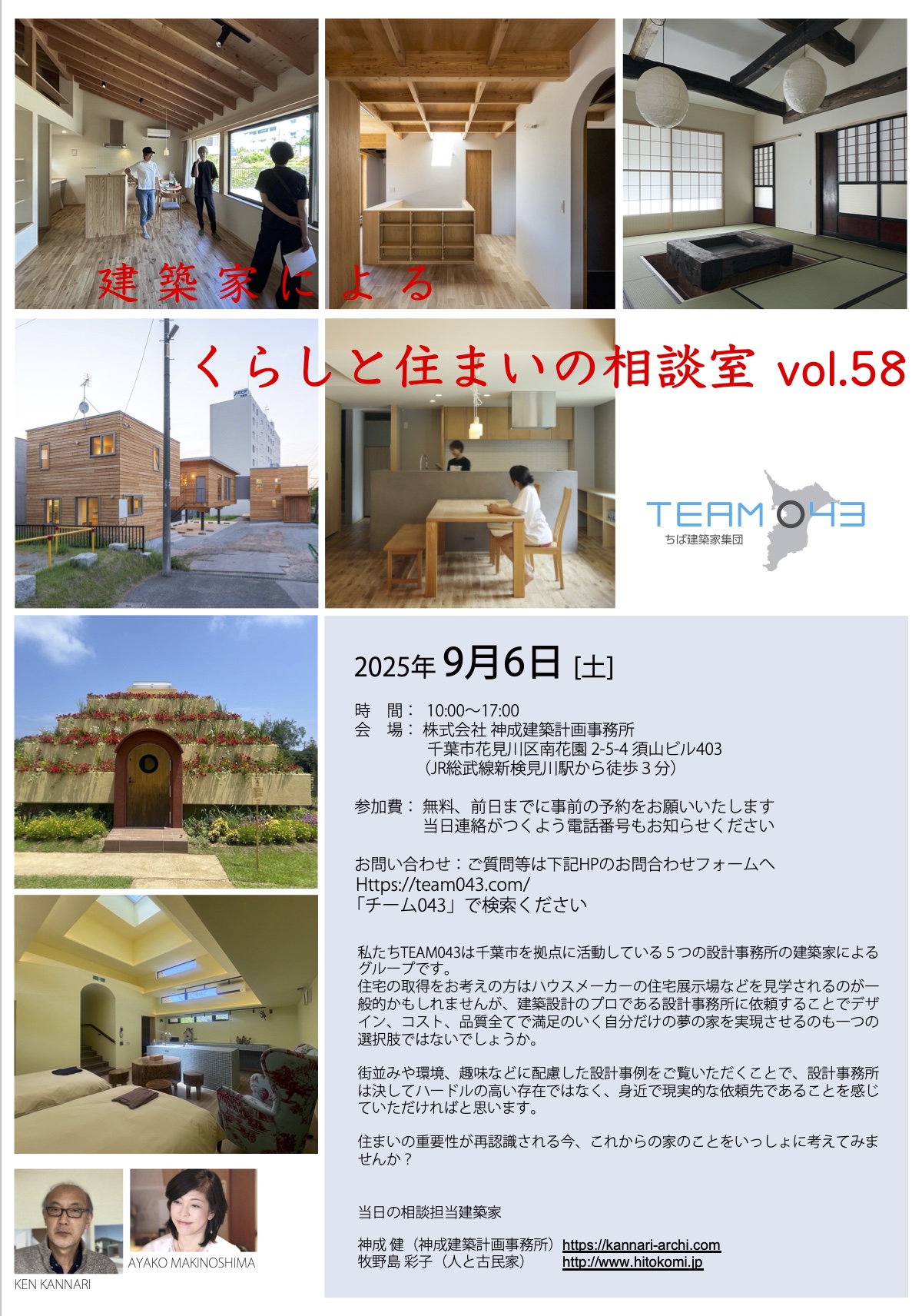 ちば建築家集団team043の暮らしと住まいの相談室が9月6日(土)に開催予定です。今回の担当は私と牧野島さんです。お気軽にご予約お願いいたします。